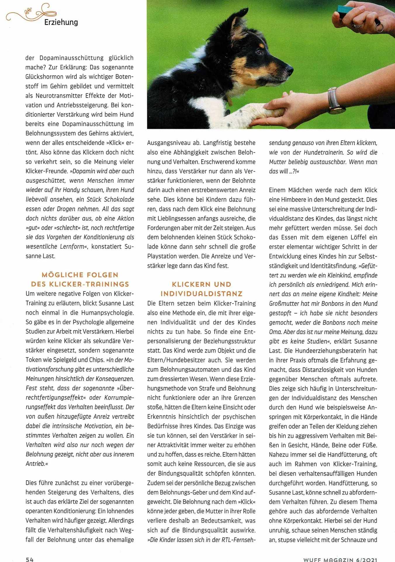 Ich engagierte mich sehr in diesem Verein, hatte jedoch das Gefühl, dass mein Hund bei der Ausbildung und klassischen Unterordnung nie freudig mitgearbeitet hat. Deswegen schaute ich mich nach anderen Beschäftigungsmöglichkeiten um. Dabei bin ich auf Clickern, Tricks einstudieren und Dogdancing gestoßen. Ich habe mich damit intensiv auseinandergesetzt und plötzlich hatten mein Hund und ich wieder mehr Freude am Training.